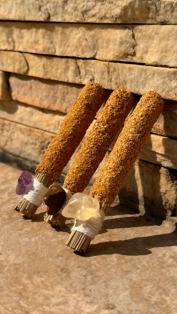 Defumadores 100% naturais, feitos manualmente com capim limão desidratado e madeira de Palo Santo.